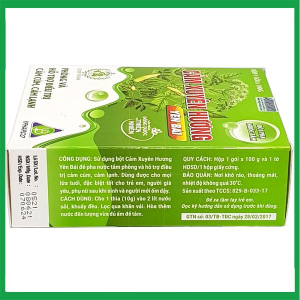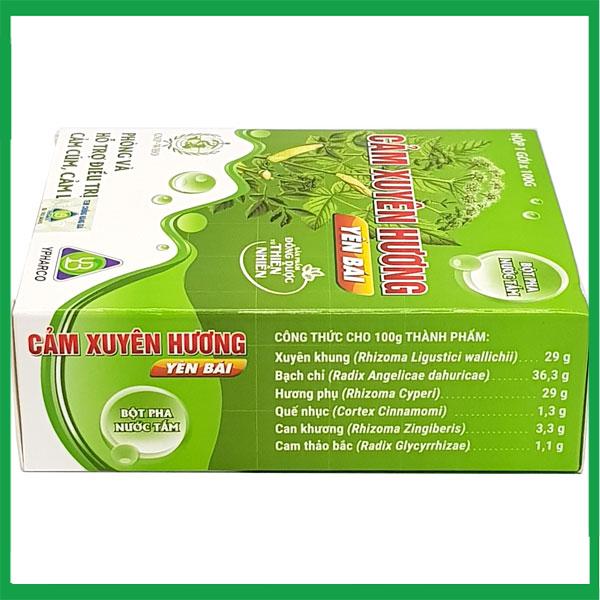 Sản phẩm sản xuất dưới dạng bột, đựng trong túi PE sau đó được đựng trong hộp giấy màu xanh. Mặt trước được in tên sản phẩm, các dược liệu được in chìm sau tên sản phẩm, 2 mặt bên được in đầy đủ về thông tin sản phẩm như: Công dụng, cách dùng, thành phần,….Lưu ý sử dụng Cảm Xuyên Hương Yên Bái gói bột tắm