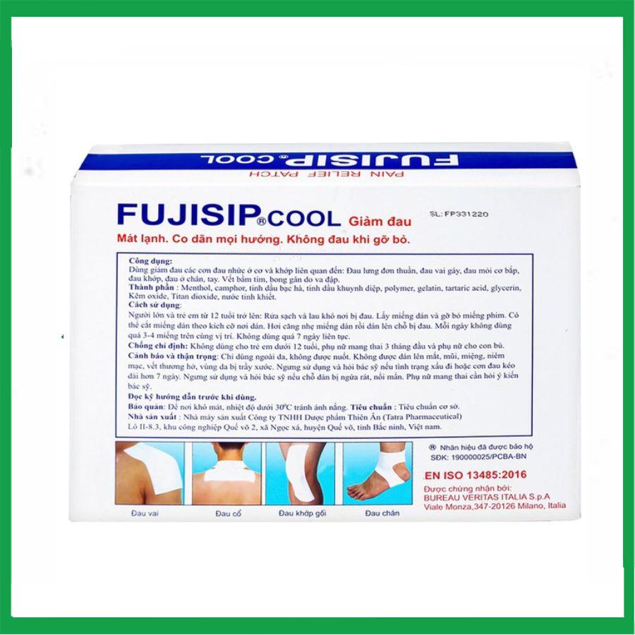 Miếng dán giảm đau Fujisip Cool là một loại miếng dán mỏng, chứa các thành phần hoạt chất giảm đau bên trong. Khi dán trực tiếp lên vùng cơ thể bị đau nhức, những hoạt chất này sẽ thẩm thấu vào bên trong giúp làm dịu cơn đau, giảm sưng tấy.