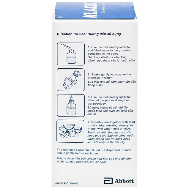 - Cách chuẩn bị hỗn dịch kháng sinh klacid 125mg để dùng: Cần thêm một lượng nước thích hợp vào các hạt thuốc cốm trong lọ và lắc để đạt được 125mg/5ml, hỗn dịch đã pha xong có thể sử dụng được trong 14 ngày khi bảo quản ở nhiệt độ bình thường trong phòng (15o – 30oC). Phải lắc kỹ lọ thuốc klacid 125mg trước khi sử dụng.