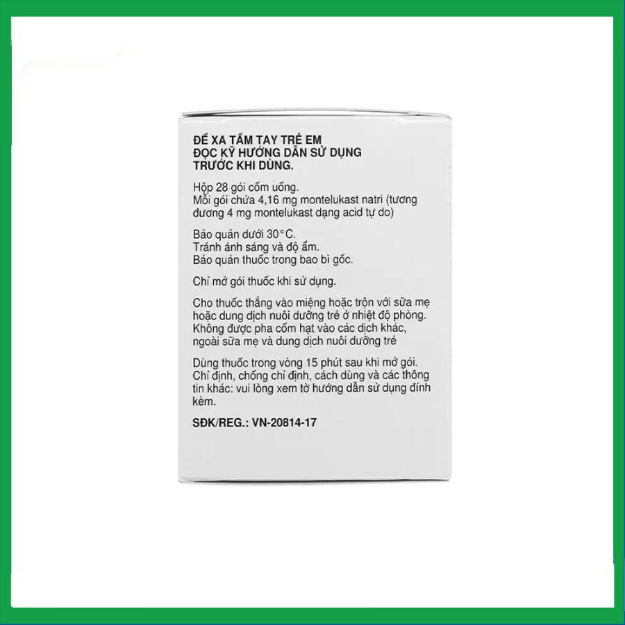 - Trẻ em từ 6 tháng tới 2 năm tuổi bị hen và/hoặc viêm mũi dị ứng quanh năm: Mỗi ngày một gói 4mg hạt cốm để uống.