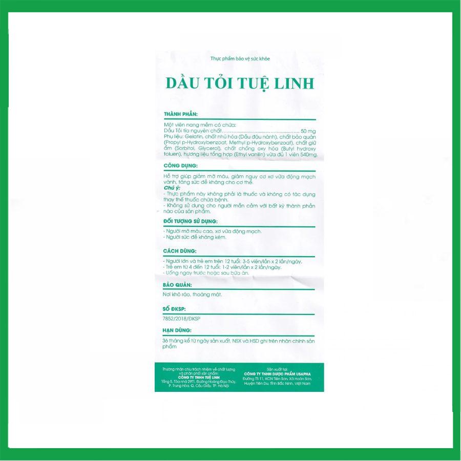 Dầu Tỏi Tuệ Linh với thành phần chính là dầu tỏi tía nguyên chất, giúp hỗ trợ giảm mỡ máu, giảm nguy cơ xơ vữa động mạch vành và tăng sức đề kháng cho cơ thể. Sản phẩm chứa thành phần đươc chiết xuất hoàn toàn từ thảo dược nên rất hiếm xảy ra tác dụng phụ khi dùng. Vì vậy, người bệnh hoàn toàn có thể yên tâm nếu muốn sử dụng lâu dài.