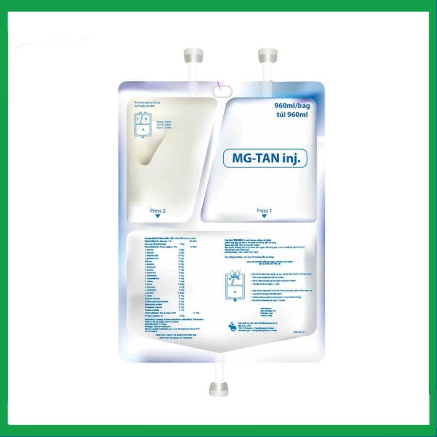 Dung dịch tiêm truyền thuốc MG-Tan 960ml chỉ định dùng cung cấp nước,chất điện giải, acid amin và calo cho bệnh nhân bằng đường tiêm truyền tĩnh mạch cho các bệnh nhân không thể dinh dưỡng bằng đường tiêu hóa hoặc dinh dưỡng bằng đường tiêu hóa không phù hợp.