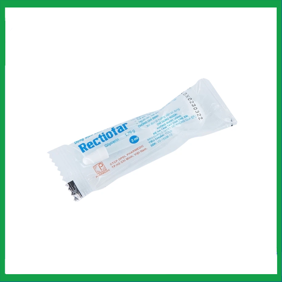 Thuốc Rectiofar của Công ty cổ phần dược phẩm dược liệu PHARMEDIC, chứa hoạt chất glycerin ở dạng dung dịch bơm trực tràng để điều trị táo bón ở trẻ em và người lớn.