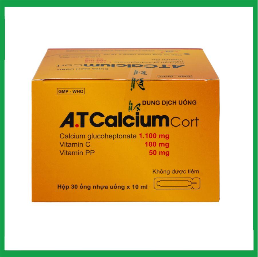 Dung dịch uống A.T Calcium cort là sản phẩm của Công ty Cổ phần Dược phẩm An Thiên chứa hoạt chất Vitamin PP, Vitamin C, Calci glucoheptonat giúp bồi dưỡng cơ thể, điều trị chứng còi xương, bổ sung calci khi chế độ ăn hàng ngày có thể không đầy đủ.