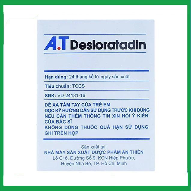 Thuốc A.T Desloratadin của Công ty An Thiên sản xuất. Thuốc A.T Desloratadin thuộc nhóm thuốc kháng histamin có thành phần chính là Desloratadine. Đây là thuốc có tác dụng giảm triệu chứng các bệnh lý như: Sổ mũi, hắt hơi, nghẹt mũi, ngứa mũi họng và ngứa, chảy nước mắt, mày đay, ngứa, phát ban.