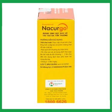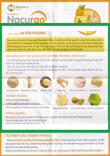 Dung dịch xịt bảo vệ da Nacurgo là sản phẩm mang công nghệ màng sinh học tự phân hủy Polyesteramide, kết hợp tinh Nghệ siêu phân tử Nano Curcumin và tinh chất Trà xanh Camellia Sinensis giúp tái tạo mô và tế bào da ở những vùng có vết loét, vết thương, thúc đẩy làm liền da và ngăn ngừa sẹo. Sự phối hợp độc đáo này giúp việc chăm sóc vết thương dễ dàng, tiện lợi và không gây đau đớn.