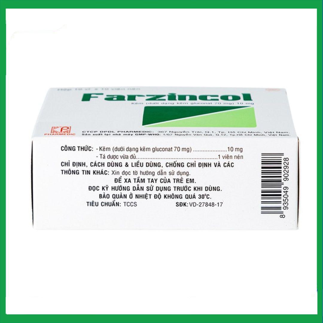 Farzincol của công ty cổ phần dược phẩm dược liệu Pharmedic, thành phần chính kẽm gluconat 70 mg (tương đương 10 mg kẽm), là thuốc dùng để điều trị bổ sung kẽm vào chế độ ăn trong các trường hợp: Bệnh còi xương, chậm tăng trưởng ở trẻ em. Phụ nữ mang thai và bà mẹ đang cho con bú. Chế độ ăn thiếu cân bằng hoặc kiêng ăn. Nuôi ăn lâu dài qua đường tĩnh mạch. Tiêu chảy cấp và mãn tính. Điều trị thiếu kẽm: Thiếu kẽm nhẹ và vừa trong các trường hợp: Suy dinh dưỡng nhẹ và vừa. Rối loạn đường tiêu hóa: Chán ăn, chậm tiêu, táo bón nhẹ, buồn nôn và nôn khi mang thai. Khó ngủ, mất ngủ, trẻ khóc đêm, suy nhược, nhức đầu...