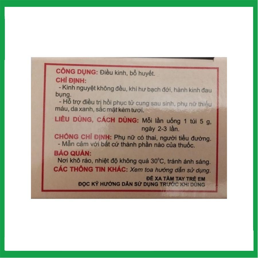 - Ngoài ra, thuốc còn có Bạch Thược, Xuyên Khung, Ích mẫu, Ngải Cứu, Hương Phụ, giúp điều hòa kinh nguyệt, khứ ứ, giảm triệu chứng đau bụng kinh.
