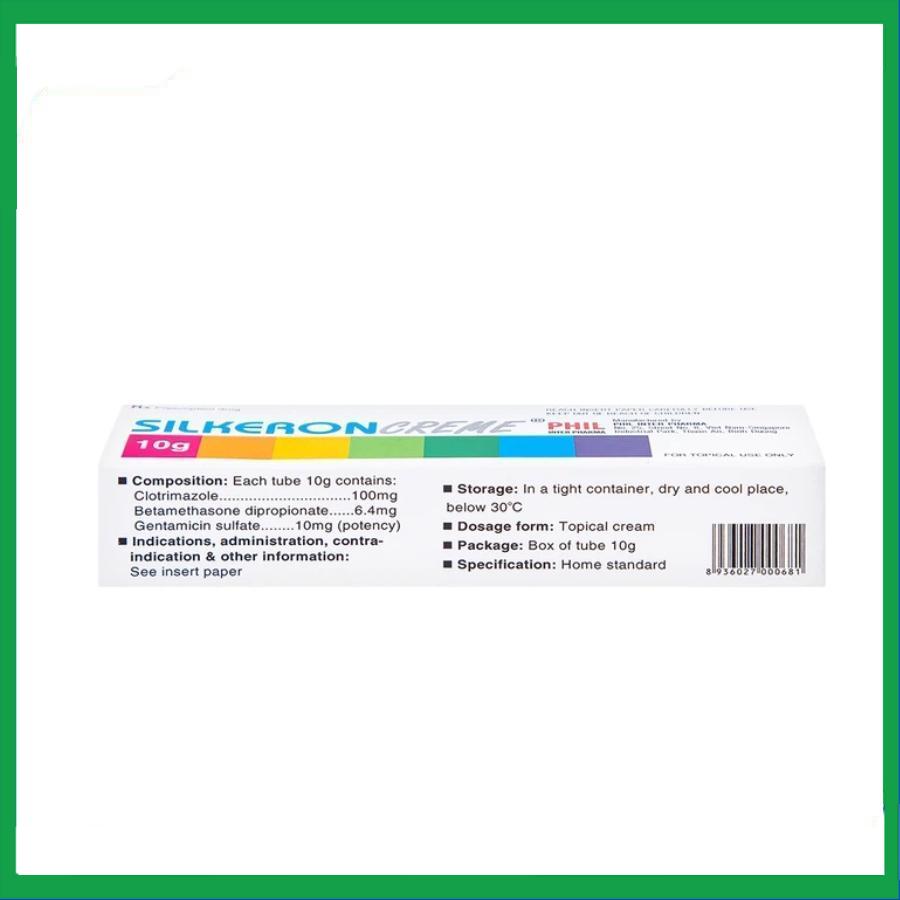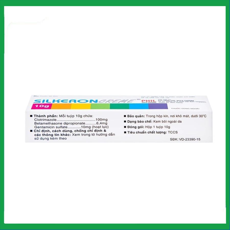 Silkeron Creme của Công ty TNHH PHIL Inter Pharma, thành phần chính là betamethason dipropionat, gentamicin, clotrimazol. SILKERONCREME là thuốc làm giảm triệu chứng viêm của các bệnh ngoài da đáp ứng với corticosteroid khi có biến chứng nhiễm khuẩn và nhiễm nấm thứ phát hay khi nghi ngờ có nhiễm khuẩn và nhiễm nấm.