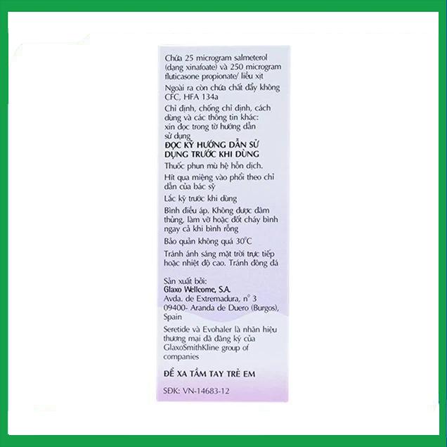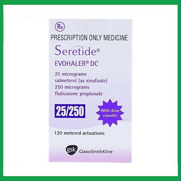 Thuốc Seretide Evohaler DC 25/250 là sản phẩm của Công ty GlaxoSmithKline (GSK), thành phần chính là Salmeterol và Fluticason, dùng điều trị bệnh hen phế quản và bệnh tắc nghẽn phổi mạn tính.