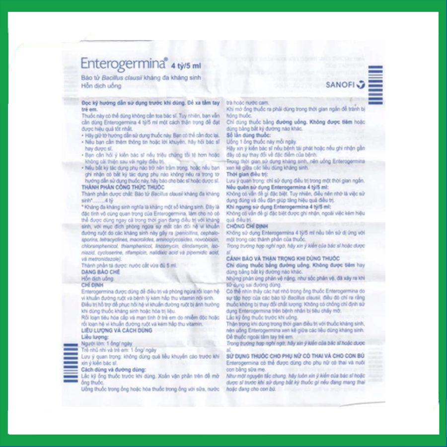 Enterogermina 4B được bào chế dạng hỗn dịch uống và đóng gói theo quy cách: Hộp 20 ống x 5ml hỗn dịch.