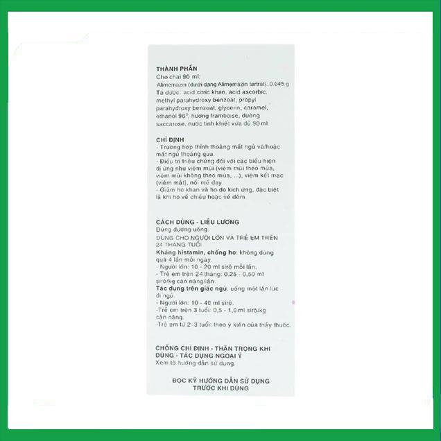 Thuốc Theralene 90ml bao gồm các thành phần alimemazin, một chất kháng histamin, điều trị chứng mất ngủ (thỉnh thoảng hoặc tạm thời). Các biểu hiện dị ứng: Viêm mũi theo mùa hoặc không theo mùa, viêm kết mạc, mề đay. Ho khan gây khó chịu, nhất là ho về đêm.