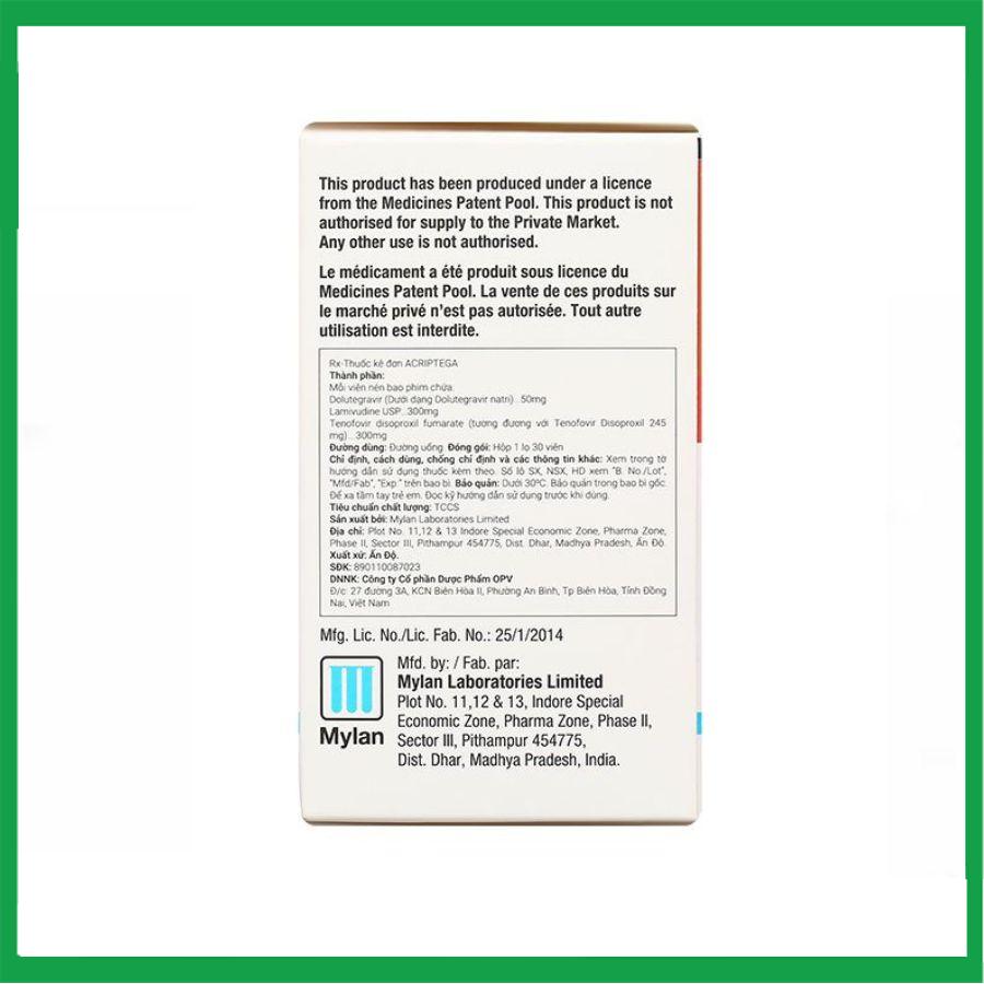 Acriptega 50Mg/300Mg/300Mg Mylan 30V là sản phẩm thuốc của công ty Mylan – Ấn Độ gồm 3 thành phần hoạt chất là Dolutegravir, Lamivudine, Tenofovir trong 1 viên thuốc. Thuốc được chỉ định trong điều trị HIV.