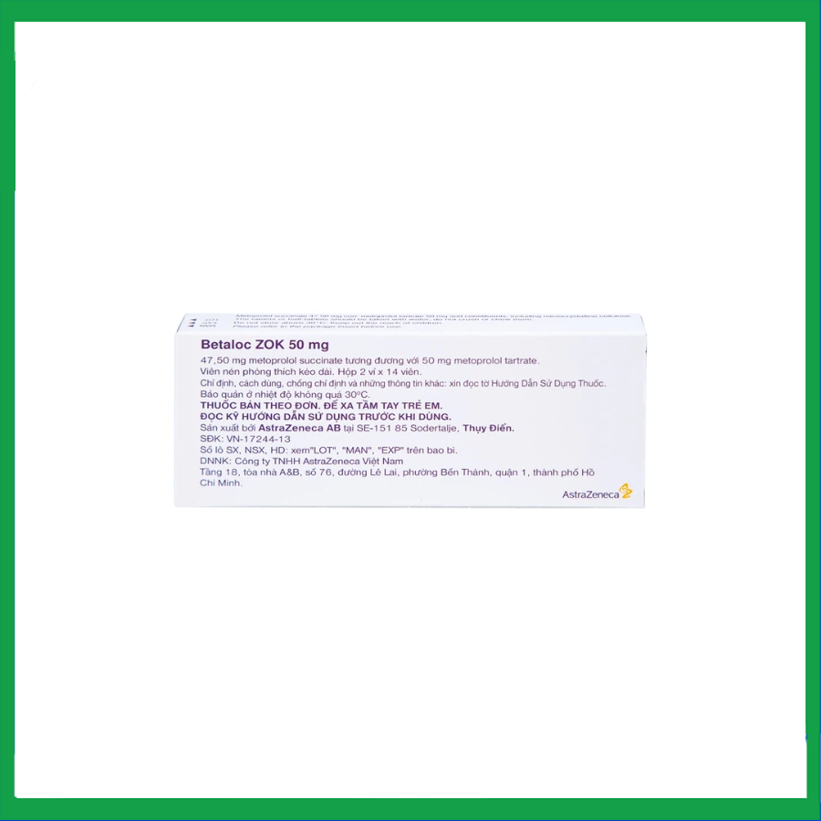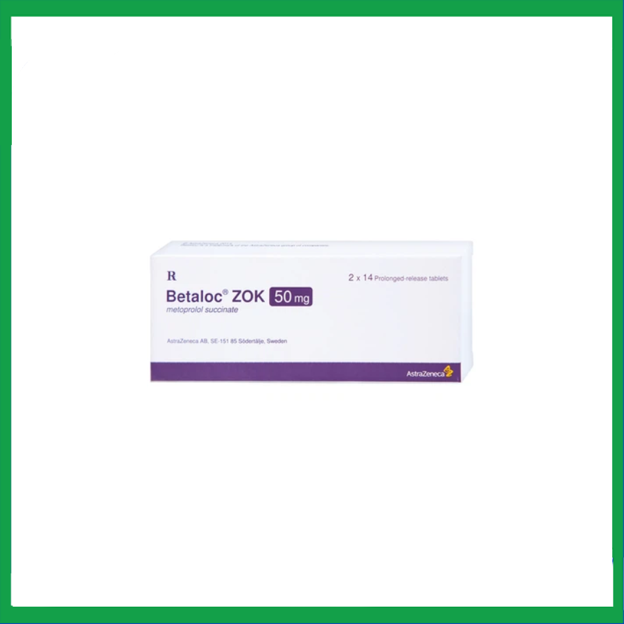 Betaloc Zok 50mg là sản phẩm của Công ty AstraZeneca (Thuỵ Điển), thành phần chính là Metoprolol Succinate. Thuốc dùng để điều trị tăng huyết áp, suy tim mạn tính ổn định, một số rối loạn nhịp tim nhanh, cơn đau thắt ngực. Ngoài ra, Betaloc Zok 50mg còn được sử dụng trong dự phòng sau nhồi máu cơ tim.