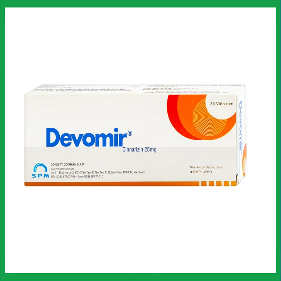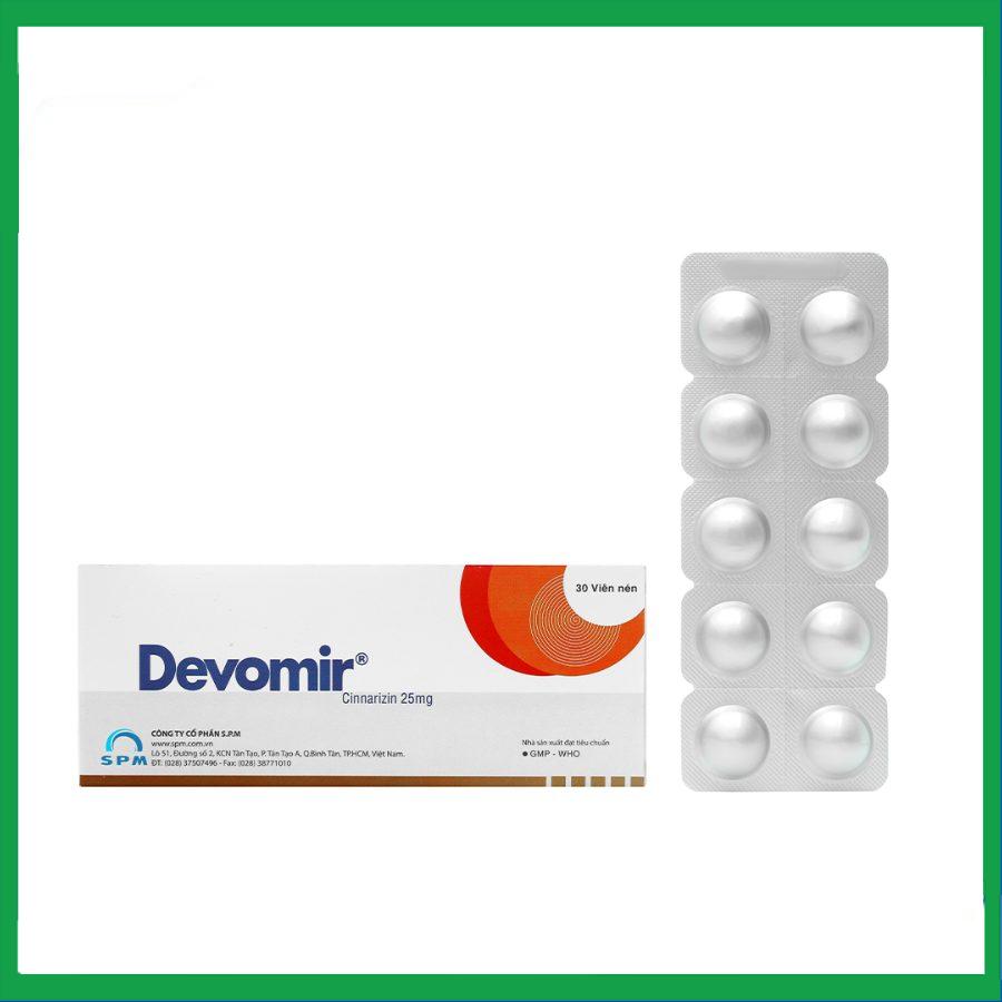 Thuốc Devomir 25 mg là sản phẩm của Công ty Cổ phần SPM, chứa hoạt chất chính là cinnarizin 25 mg. Thuốc được chỉ định để phòng ngừa say sóng, say tàu xe và điều trị các triệu chứng đau nửa đầu, rối loạn tiền đình, rối loạn tuần hoàn ngoại vi.