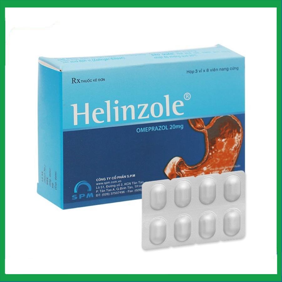 Helinzole của Công ty cổ phần S.P.M, thành phần chính Omeprazole, là thuốc dùng để điều trị trào ngược dịch dạ dày – thực quản, loét dạ dày – tá tràng, hội chứng Zollinger – Ellison. Ngoài ra, thuốc cũng được dùng kết hợp với thuốc kháng sinh để tiêu diệt vi khuẩn H. pylori gây nhiễm trùng dạ dày.