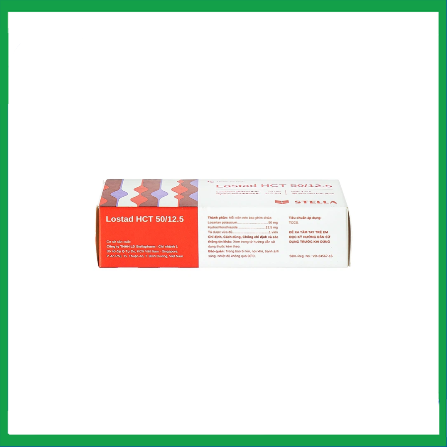 Lostad HCT 50/12,5 của Công ty TNHH LD Stellapharm, thành phần chính losartan và hydroclorothiazide, là thuốc tác dụng lên hệ tim mạch được sử dụng để điều trị tăng huyết áp, giảm nguy cơ đột quỵ ở những bệnh nhân tăng huyết áp và phì đại tâm thất trái.