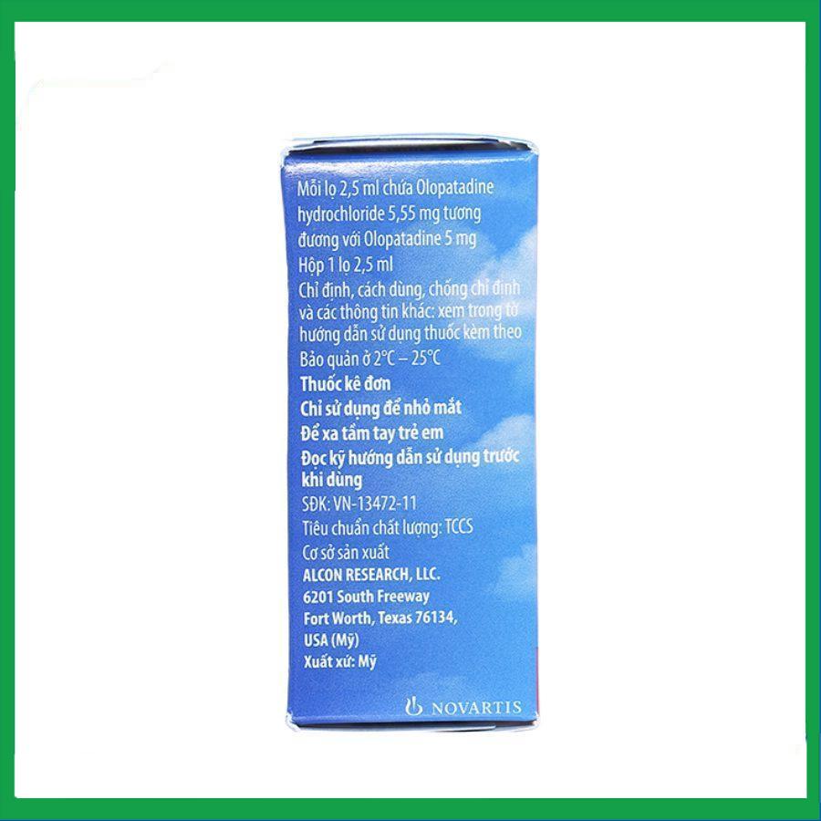 Thành phần chính là Olopatadin, là thuốc dùng để phòng ngừa và điều trị các triệu chứng và dấu hiệu ở mắt của bệnh viêm kết mạc dị ứng.
