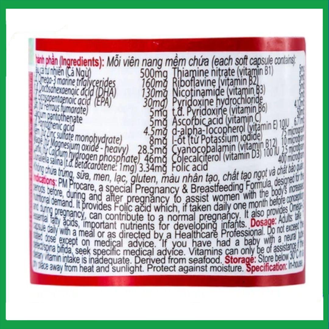 Procare - Thuốc bổ cho bà bầu là sản phẩm của Công ty Catalent Australia Pty Ltd, có thành phần chính gồm: Dầu cá tự nhiên (Cá ngừ), omega-3, DHA , EPA (icosapent), pyridoxone hydrochloride (vitamin B6), sắt fumarate, calcium hydrogen, dunaliella salina, thiamine nitrate (vitamin B1), riboflavine (vitamin B2), nicotinamide (vitamin B3), ascorbic acid (vitamin C), d-alpha-Tocopherol (vitamin E), I-ốt (Từ Potassium iod), cyanocobalamin (vitamin B2), colecalciferol (vitamin D3), folic acid.