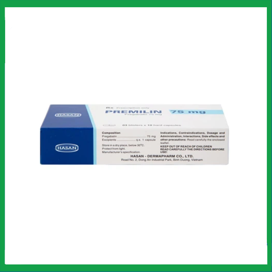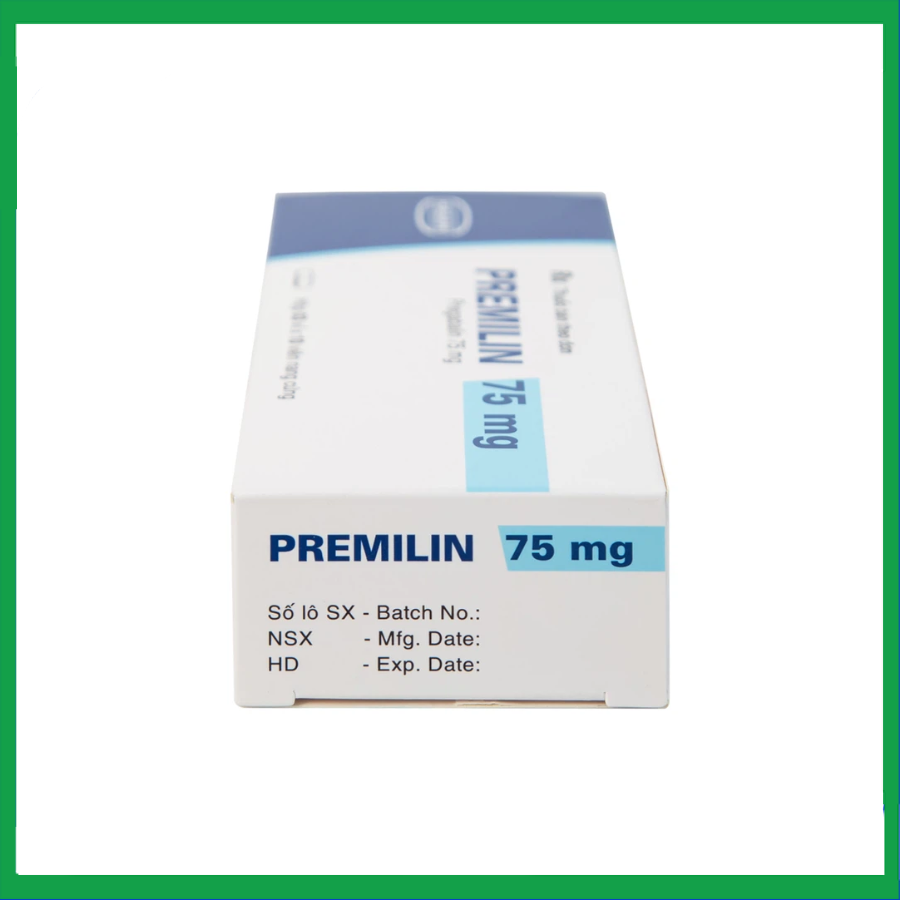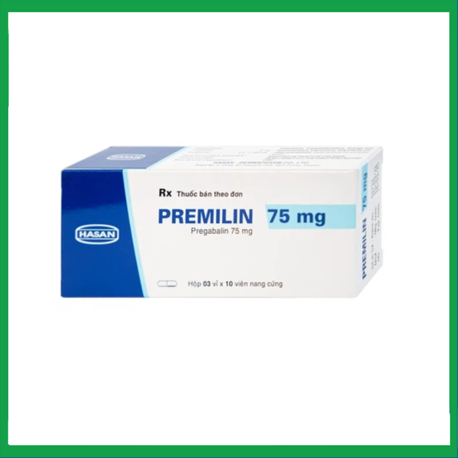 Premilin 75mg của công ty TNHH Hassan - Dermapharm, thành phần chính pregabalin. Là thuốc dùng để hỗ trợ trong điều trị động kinh cục bộ có hay không kèm theo cơn toàn thể thứ phát ở người lớn, rối loạn lo âu lan toả (GAD) ở người lớn, đau do nguyên nhân thần kinh (ngoại vi hay trung ương) ở người lớn, đau cơ do xơ hoá.