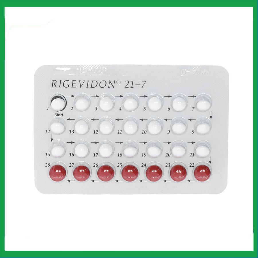 - Mỗi hộp Rigevidon (21+7) có chứa 1 vỉ hoặc 3 vỉ thuốc có đánh số. Cách thiết kế đánh số này giúp bạn ghi nhớ ngày dùng thuốc. Vỉ thuốc được đánh dấu với ngày trong tuần cho mỗi viên thuốc cần uống. Theo hướng dẫn mũi tên trên vì bạn cần uống các viên trắng trong 21 ngày và các viên nâu đỏ trong 7 ngày cho đến hết vỉ thuốc. Trong thời gian uống viên nâu đỏ, vào khoảng ngày thứ 2 hoặc thứ 3 bạn sẽ bị xuất huyết giống như kinh nguyệt, hay còn gọi là "chu kỳ hàng tháng”.