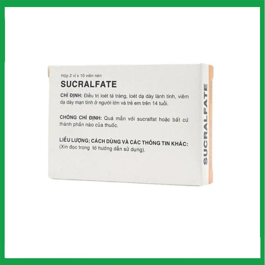 SUCRALFATE được bào chế dưới dạng viên nén. Viên nén dài màu trắng, một mặt trơn, một mặt có vạch ngang ở giữa, cạnh và thành viên lành lặn. Hộp 2 vỉ X 10 viên nén dài. Hộp 10 vỉ x 10 viên nén dài.