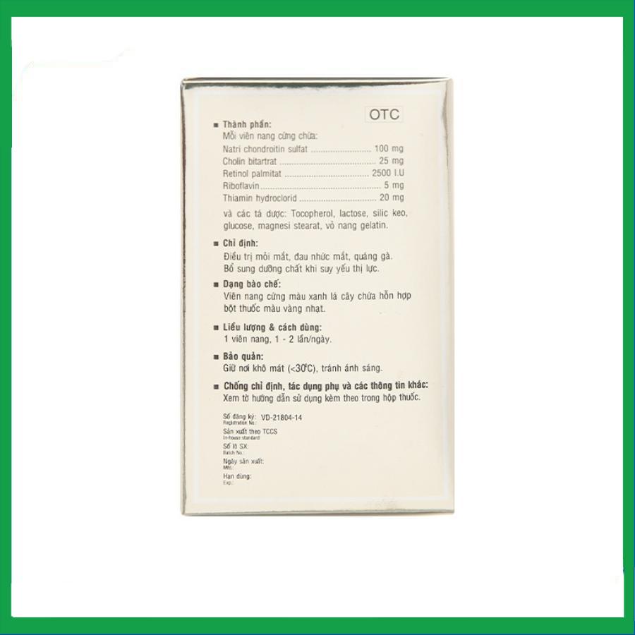 Tobicom® của Công ty Cổ phần Công nghệ Sinh học – Dược phẩm ICA, thành phần chính natri chondroitin sulfat, retinol palmitat (vitamin A), cholin bitartrat, riboflavin (vitamin B2) và thiamin hydroclorid (vitamin B1), là thuốc dùng để điều trị mỏi mắt, đau nhức mắt, quáng gà, bổ sung dưỡng chất khi suy yếu thị lực.