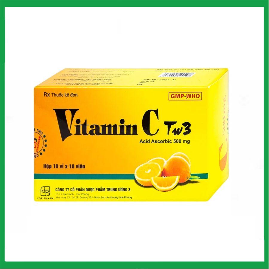 Vitamin C TW3 có dạng bào chế là viên nén bao phim, đóng gói thành hộp 10 vỉ x 10 viên.