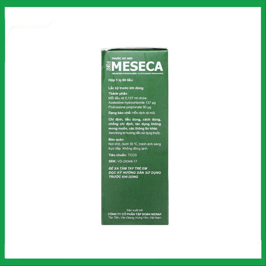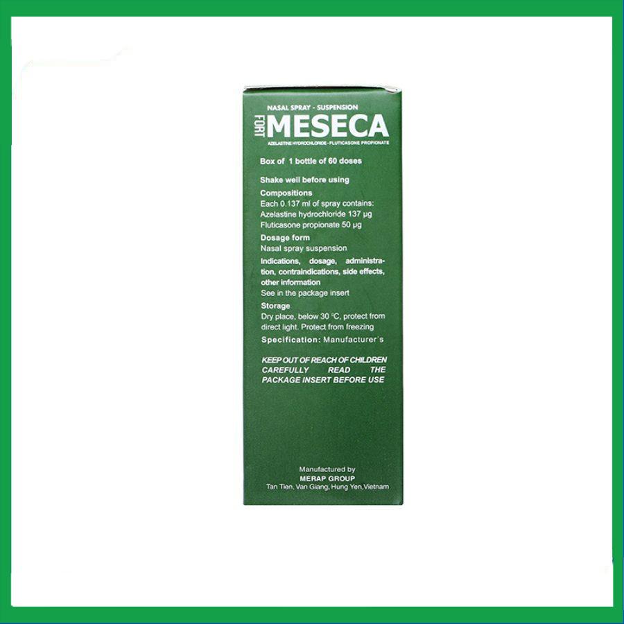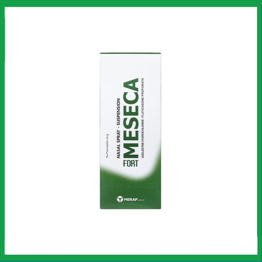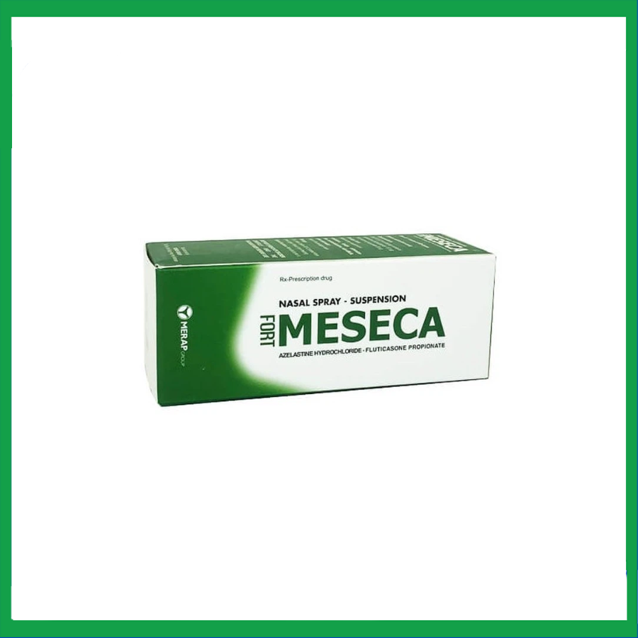 Meseca Fort là sản phẩm của Công ty Cổ phần Tập đoàn Merap, có thành phần chính gồm azelastine hydrochloride và fluticasone propionate. Thuốc được dùng để giảm các triệu chứng của viêm mũi dị ứng theo mùa và viêm mũi quanh năm ở người lớn và trẻ em từ 6 tuổi trở lên.