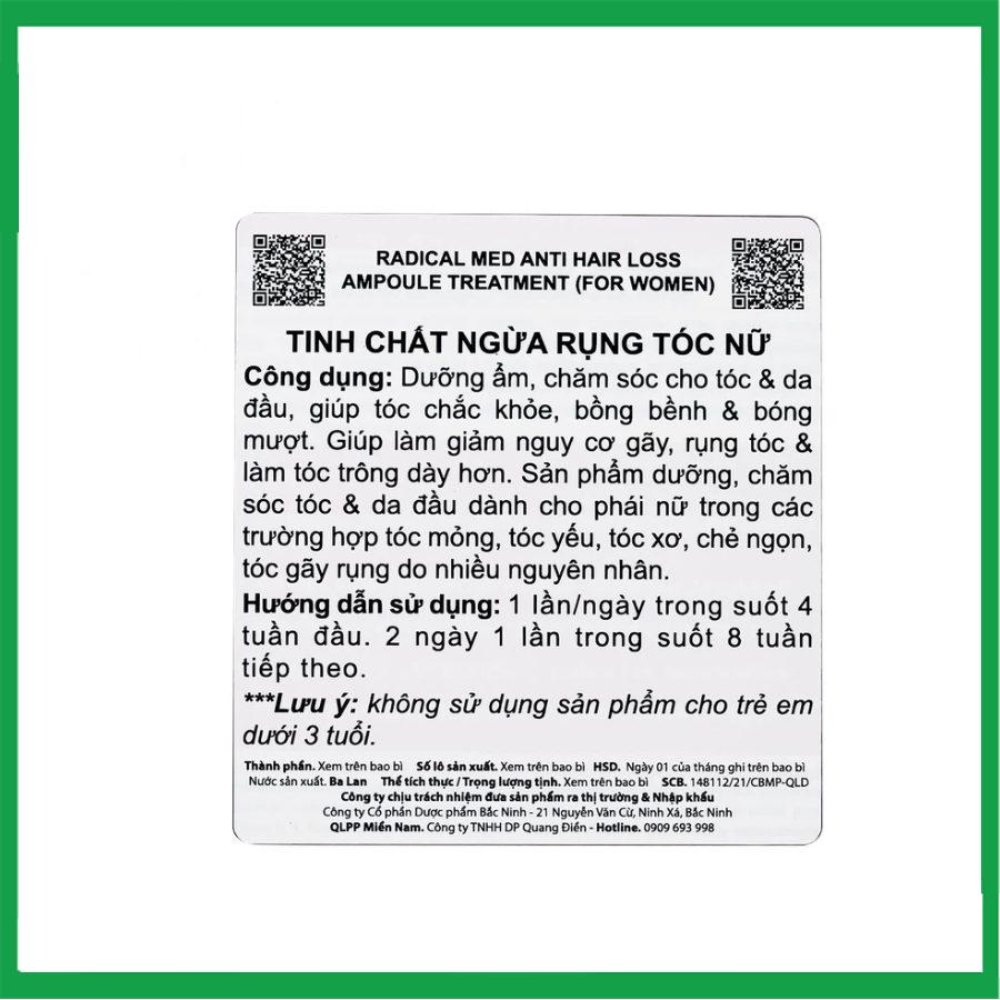 Radical Med Anti-Hair Loss Ampoule Treatment (For Women) giúp dưỡng ẩm, chăm sóc cho tóc và da đầu, giúp tóc chắc khỏe, bồng bềnh và bóng mượt. Giúp làm giảm nguy cơ gãy, rụng tóc và làm tóc trông dày hơn.
