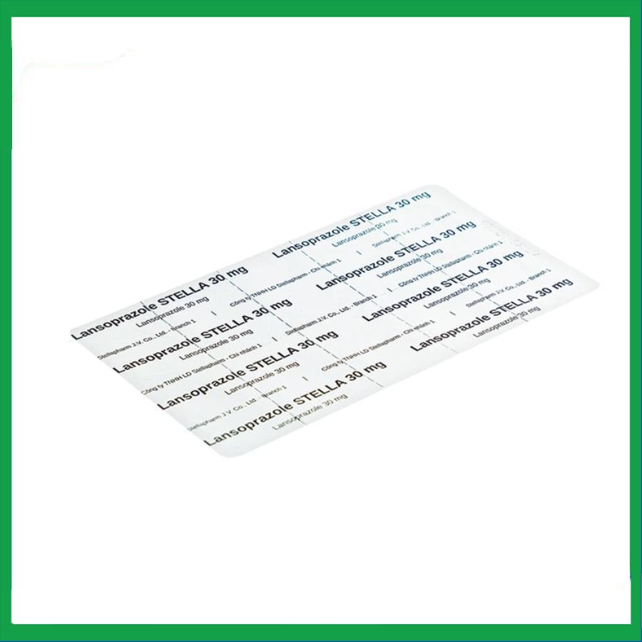 Viên Lansoprazol 30 là viên nang cứng số 1, đầu nang màu đỏ đục in logo của công ty Stellapharm màu trắng, thân nang màu tím trong, chứa vi hạt màu trắng đến trắng ngà.