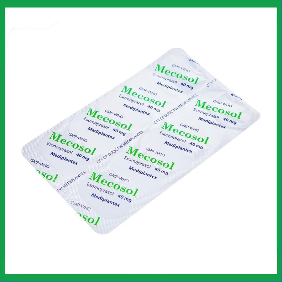 Thuốc Mecosol là sản phẩm của Công ty Cổ phần Dược TW Mediplantex, với thành phần chính esomeprazol (dạng vi hạt bao tan trong ruột chứa esomeprazol magnesium dihydrat) 40mg. Đây là thuốc được sử dụng trong điều trị bệnh trào ngược dạ dày thực quản (GERD) và được sử dụng kết hợp với amoxicillin và clarithromycin (Biaxin) để điều trị tình trạng loét dạ dày và nhiễm H. pylori. Nó cũng được sử dụng để điều trị hội chứng Zollinger – Ellison. Esomeprazole kê đơn được sử dụng để điều trị chứng ợ nóng thường xuyên.