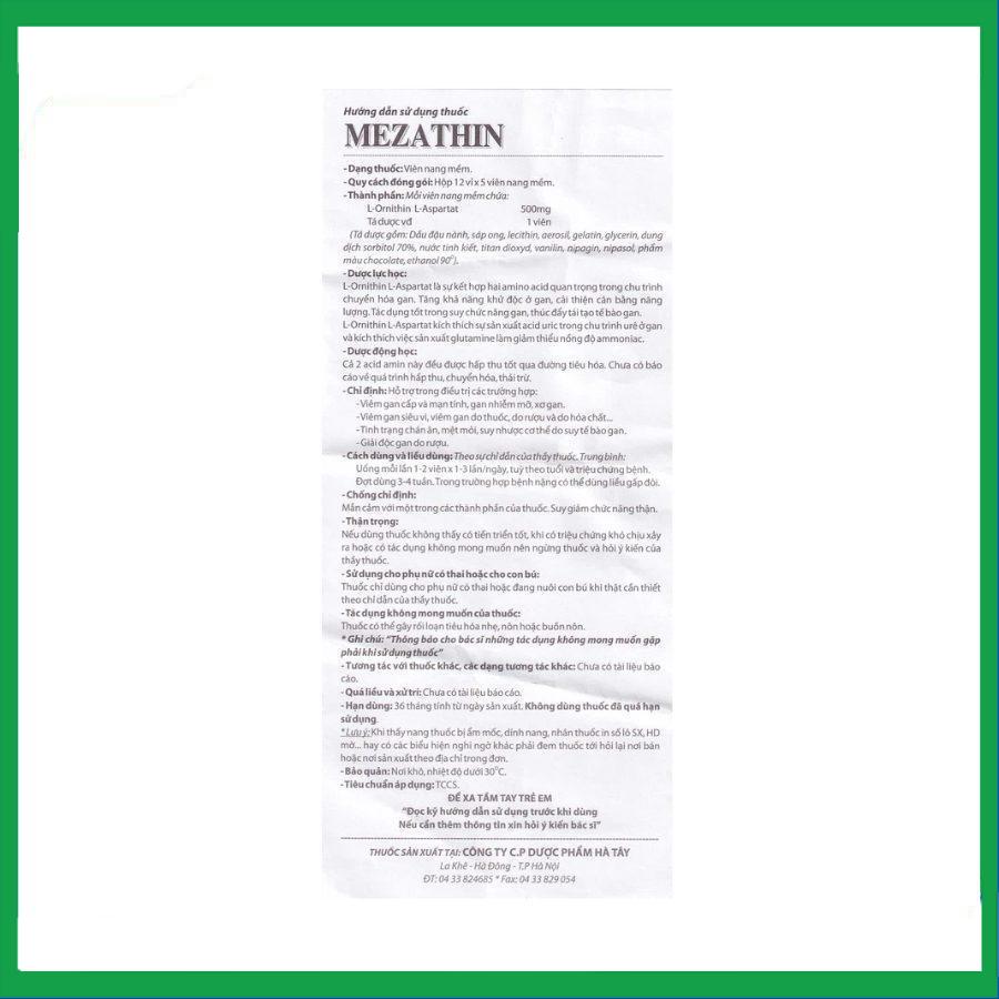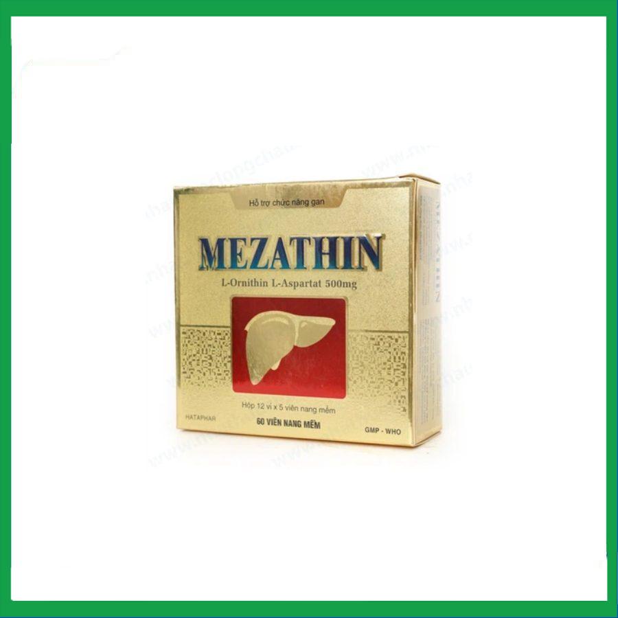 Thuốc Mezathin là sản phẩm của Dược phẩm Hà Tây, có thành phần chính L – Ornithin L – Aspartat với hàm lượng 500 mg. Thuốc dùng để hỗ trợ điều trị các bệnh về gan như: Viêm gan cấp và mạn tính, gan nhiễm mỡ, xơ gan, viêm gan siêu vi, viêm gan do thuốc, do rượu và do hóa chất…; cải thiện tình trạng chán ăn, mệt mỏi, suy nhược cơ thể do suy tế bào gan; giải độc gan do rượu.