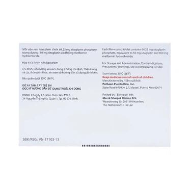 Thuốc Janumet 50/850mg là sản phẩm của Công ty Merck Sharp & Dohme (MSD), thành phần chính bao gồm Sitagliptin Phosphate Monohydrate và Metformin Hydrochloride. Thuốc được dùng để điều trị đái tháo đường type 2. Sản phẩm cần tư vấn từ dược sỹ. |