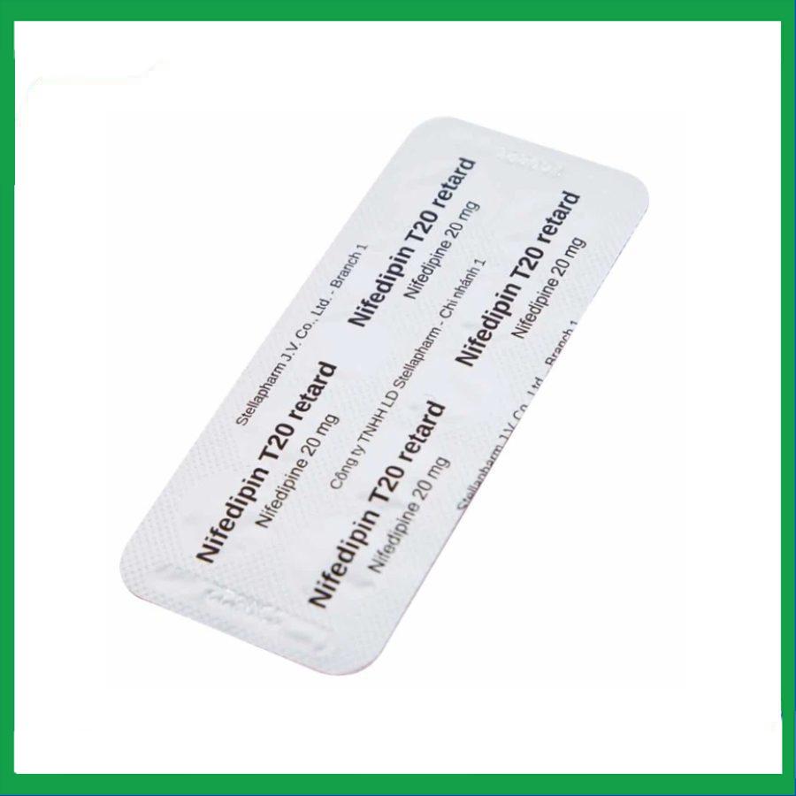 Thuốc Nifedipin T20 Retard là sản phẩm của Stellapharm, thành phần chính là nifedipine. Nifedipin T20 retard có tác dụng dự phòng đau thắt ngực, đặc biệt khi có yếu tố co mạch như trong đau thắt ngực kiểu Prinzmetal; điều trị tăng huyết áp.