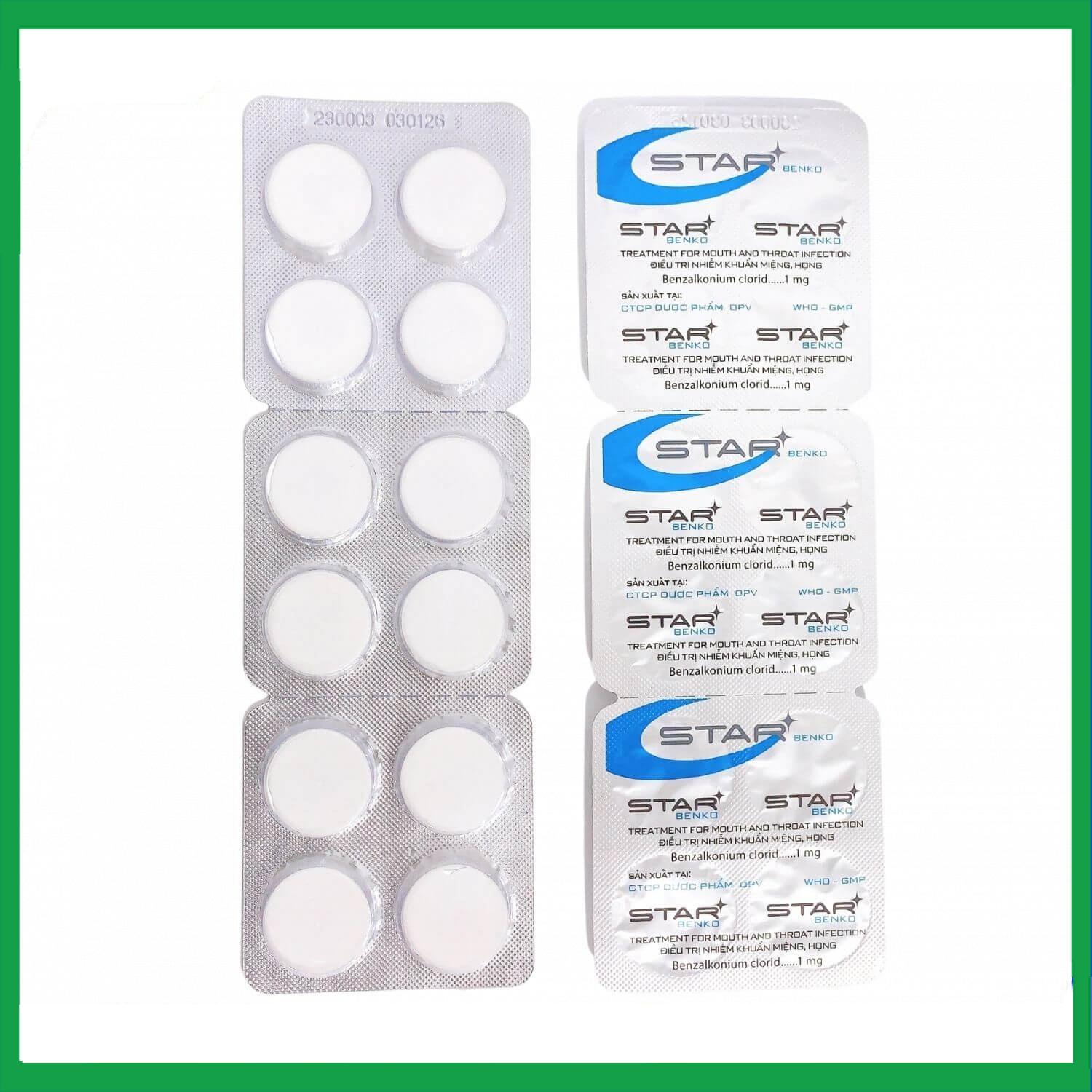 Star Benko của Công ty Cổ phần Dược phẩm OPV, thành phần chính là benzalkonium clorid 1mg. Thuốc dùng để chỉ định điều trị nhiễm khuẩn đường miệng họng.