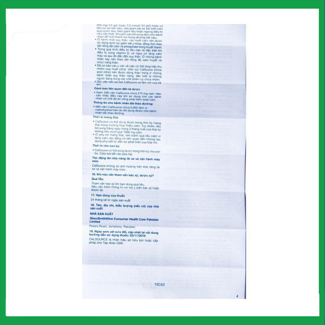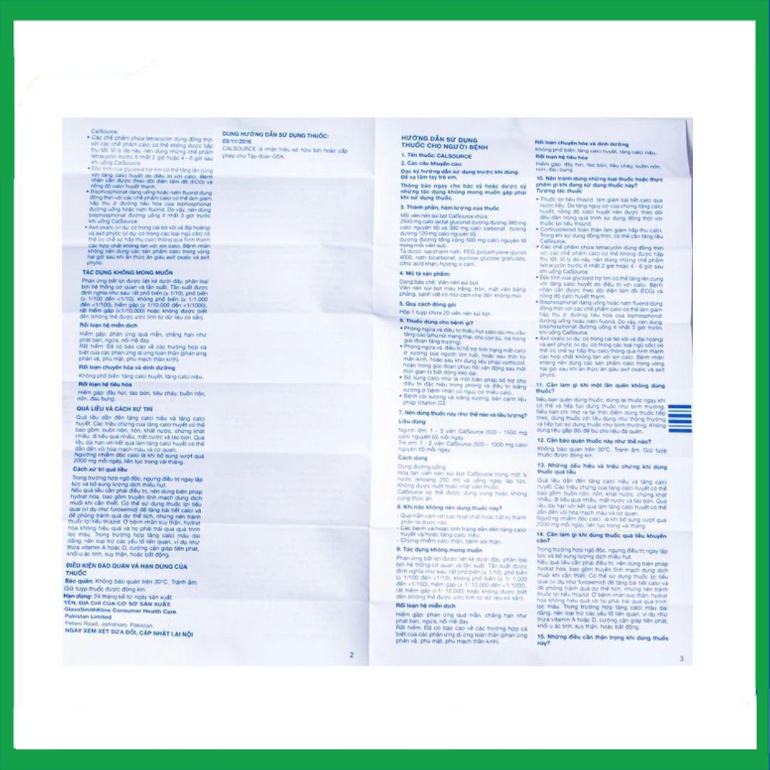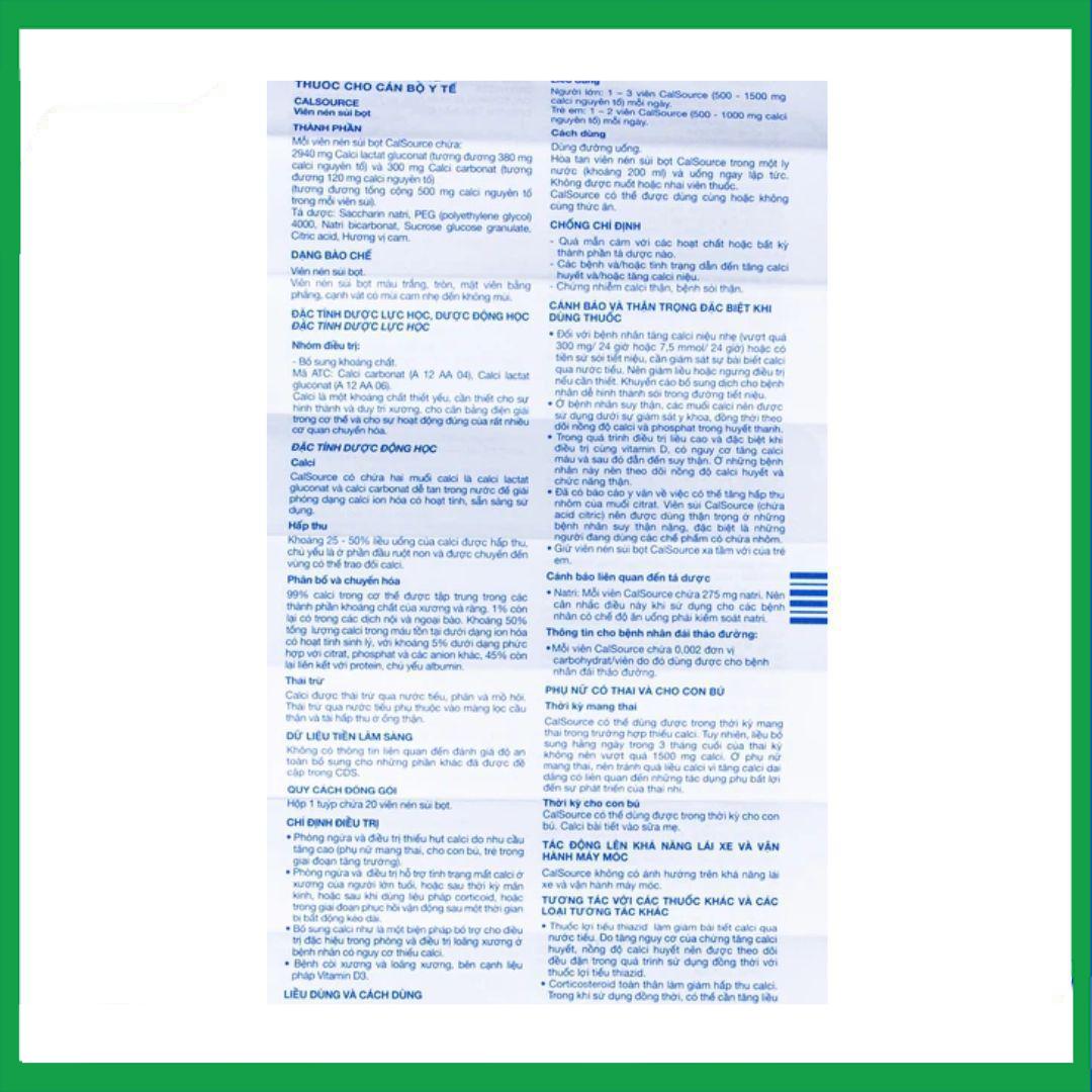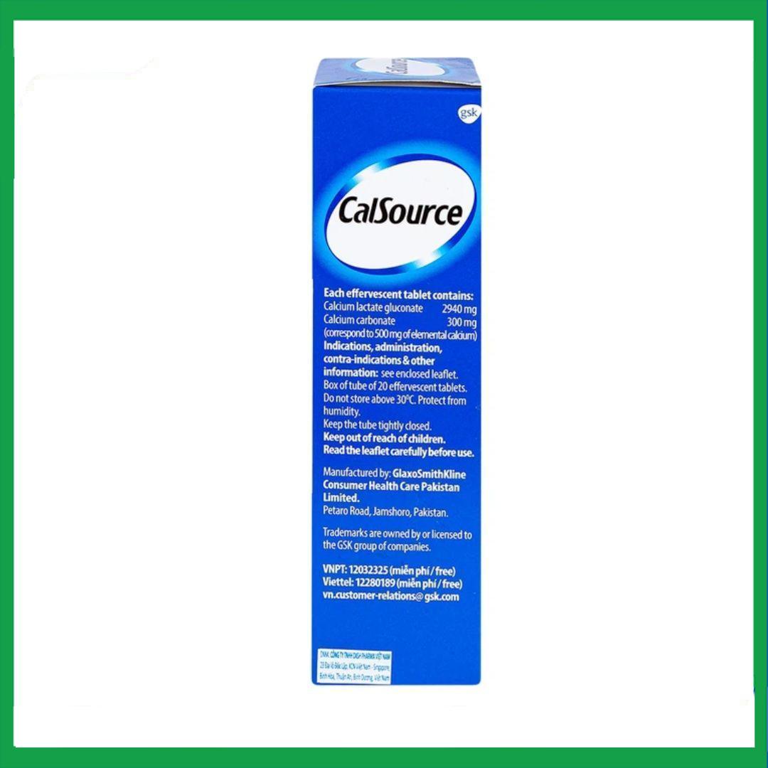 Tuýp canxi Calsource 500mg được sản xuất bởi GlaxoSmithKline (Anh), được bán trên thị trường dưới dạng tuýp 20 viên.