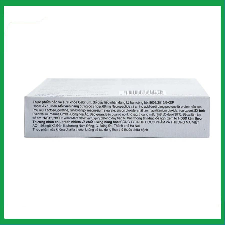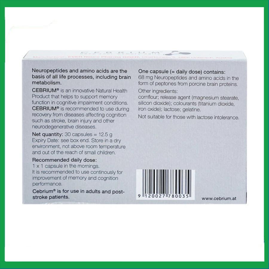 Cebrium nhập khẩu từ Áo, sản xuất trên công nghệ hiện đại giúp cải thiện chức năng nhận thức và trí nhớ sau đột quỵ và sau các tổn thương thần kinh. Bên cạnh đó còn hỗ trợ cải thiện trí nhớ cho người cao tuổi, tăng khả năng tập trung, tăng khả năng chịu đựng về trí não do Stress.