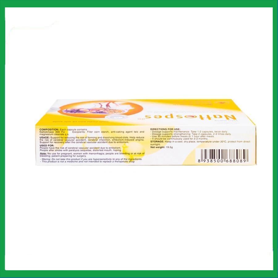 Nattospes với thành phần chủ yếu là Nattokinase, là một loại enzyme được chiết xuất từ đậu nành lên men hay còn gọi là Natto - món ăn truyền thống của rất nhiều người Nhật. Nattospes có tác dụng tiêu cục máu đông, hạn chế nguy cơ đột quỵ, tai biến và tăng cường sức khỏe tuần hoàn của cơ thể, giúp bạn an tâm tận hưởng cuộc sống khỏe mạnh.