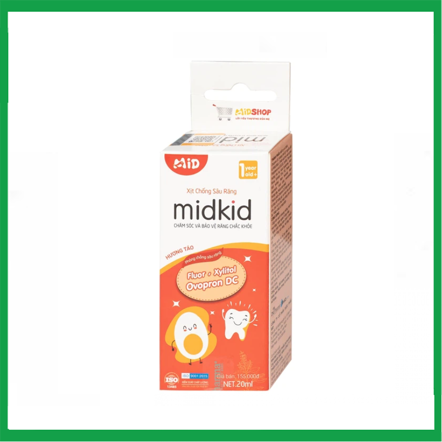 Xịt chống sâu răng Midkid chăm sóc và bảo vệ răng chắc khỏe. Có chứa thành phần Ovopron DC, Fluor và Xylitol, sản phẩm giúp làm sạch khoang miệng, bảo vệ men răng, ngăn ngừa ố vàng răng, ngăn chặn mảng bám chứa vi khuẩn gây sâu răng. Nguồn gốc từ Nhật Bản, sử dụng an toàn cho cả trẻ em, phụ nữ có thai hoặc đang cho con bú.